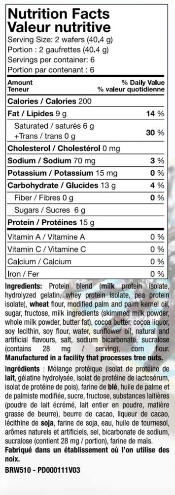 Ingrédients : mélange protéique (isolat de protéine de lait, gélatine hydrolysée, isolat de protéine de lactosérum, isolat de protéine de pois), farine de blé, huile de palme et de palmiste modifiée, sucre, fructose, substances laitières (poudre de lait écrémé, lait entier en poudre, matière grasse de beurre), beurre de cacao, liqueur de cacao, lécithine de soja, farine de soja, eau, huile de tournesol, arômes naturels et artificiels, sel, bicarbonate de sodium, sucralose (28 mg/portion), farine de maïs.